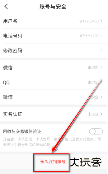 4、在账号与安全页面中,点击“永久注销账号”选项,进入账号注销流程。