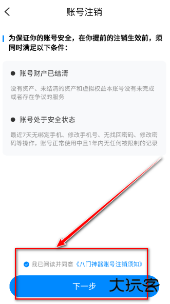 5、页面会显示《八门神器账号注销须知》,阅读后勾选“我已阅读并同意”,再点击“下一步”。