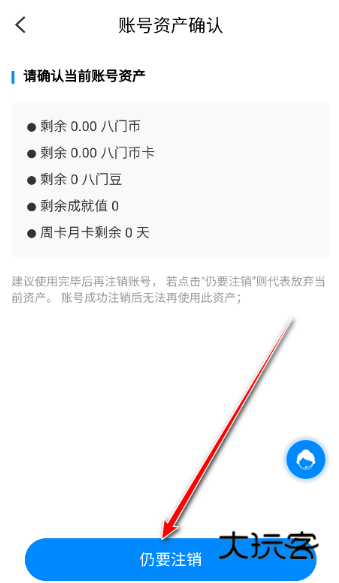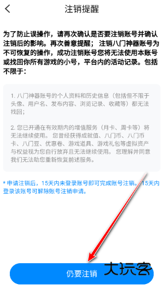 8、最后,再次点击“仍要注销”,即可完成八门神器账号的永久注销操作。