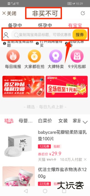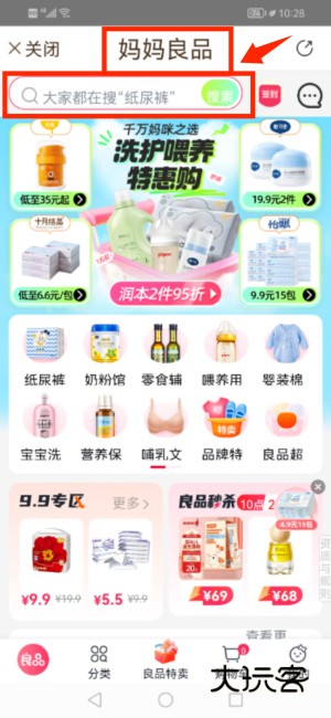 2、在妈妈良品专区搜索纸尿裤等母婴用品信息。