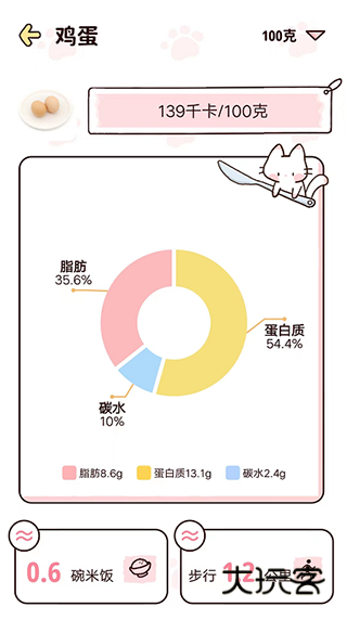 4、在【鸡蛋】页面,就可查看到食物热量和需要消耗热量的运动数值。