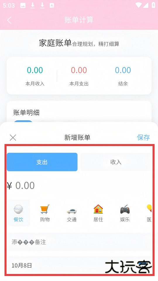 3、在新增账单界面,选择【支出】或【收入】,填写金额,选择消费分类,还可添加备注和选择日期。
