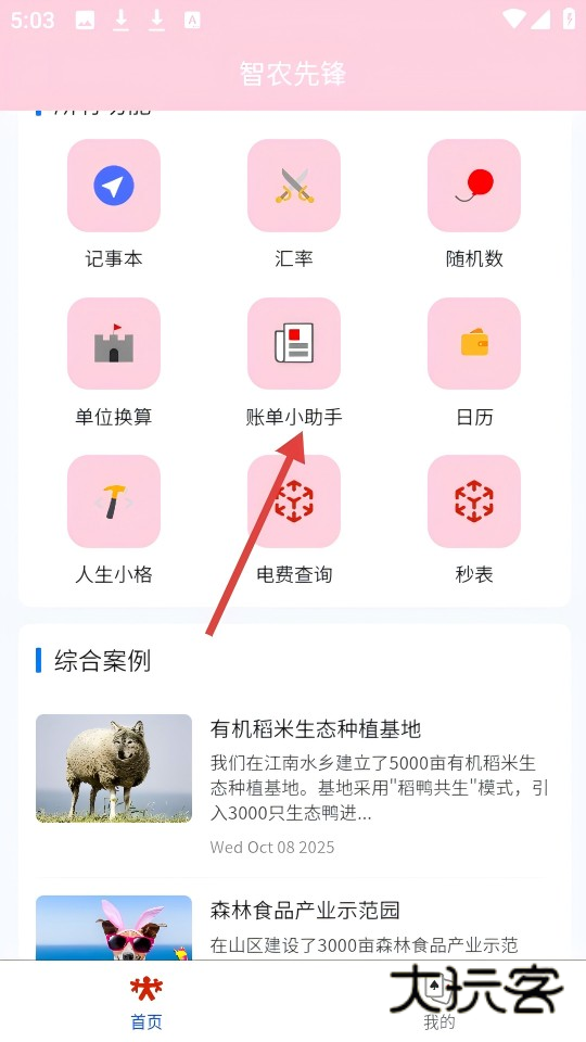 1、在【智农先锋】首页,点击【账单小助手】图标,进入账单计算页面。