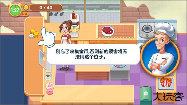 4、顾客吃完会在桌面留下金光闪闪的硬币,3 秒内快速点击收集!如果忘记收钱,空座位会被餐盘占住,新客人就无法入座啦