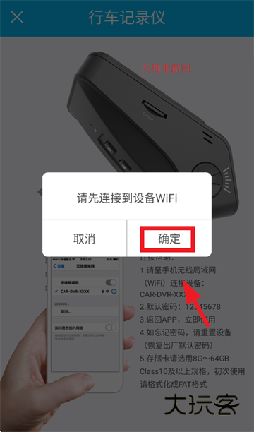 在请先连接到设备WiFi提示界面点击确定,跳转无线局域网(WiFi)连接设备:CAR-DVR-XXXX,默认密码:12345678,返回APP使用即可
