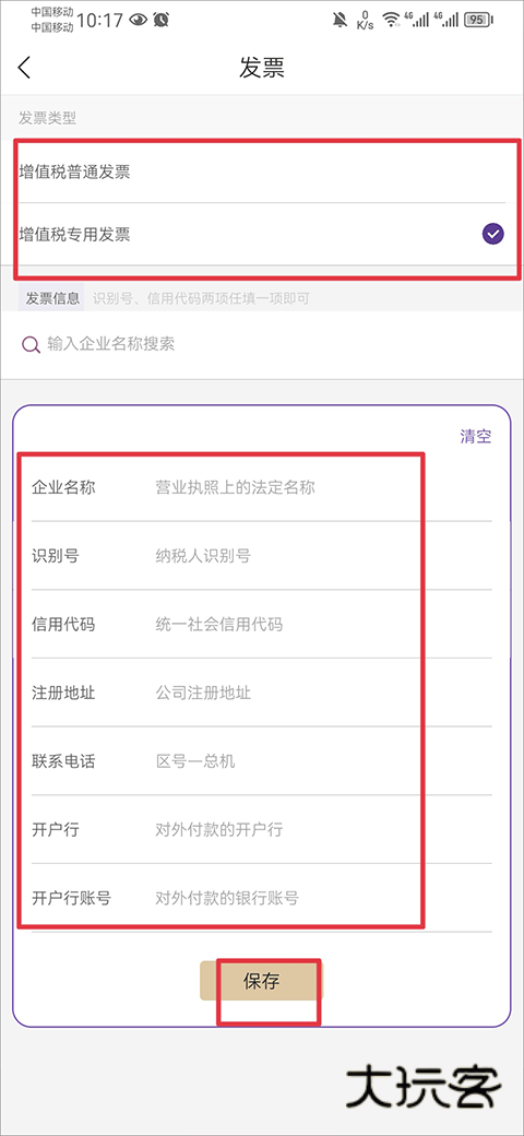 6、然后选择发票类型并将企业名称、识别号、信用代码、注册地址、联系电话、开户行、开户行账号信息完善后点击保存