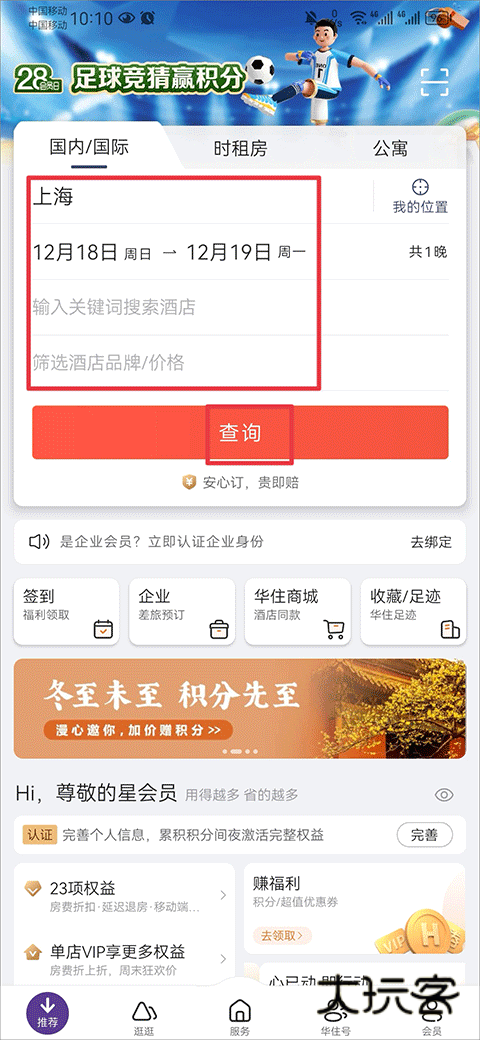 1、打开app后,在推荐界面中选择入住地址、时间、酒店后,点击查询