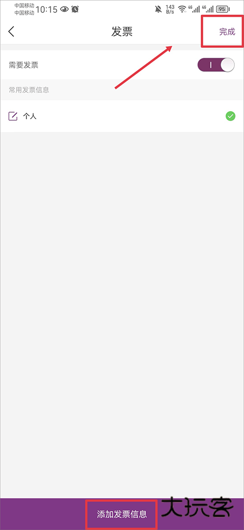 5、若是个人开票可以直接点击右上角完成,若是企业开票则需要点击下方添加发票信息