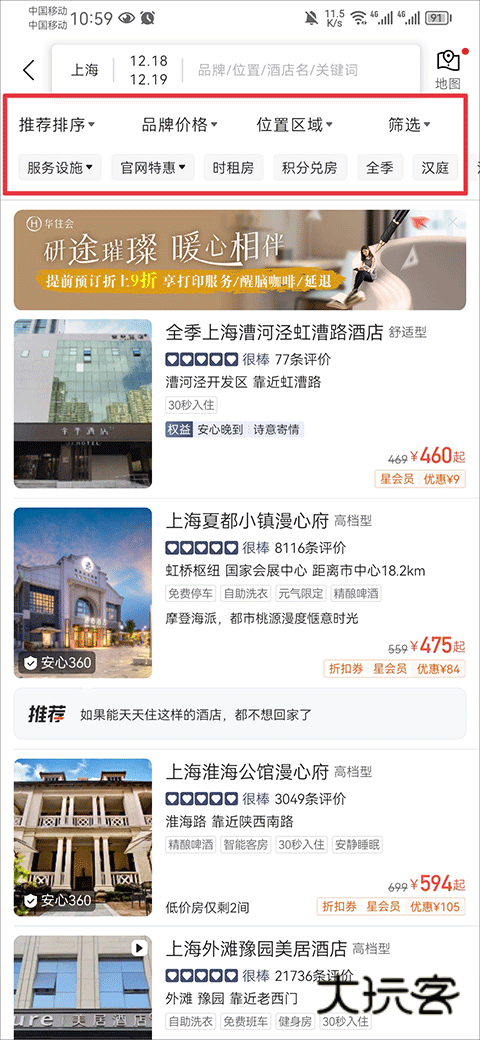 2、用户可以根据品牌价格、位置区域、入住类型等条件来筛选合适的酒店