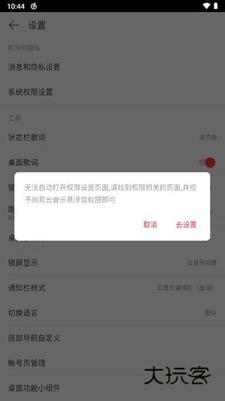 4、点击开启桌面歌词,页面出现一个设置提醒,需要开启网易云音乐悬浮窗权限,点击设置。