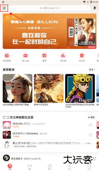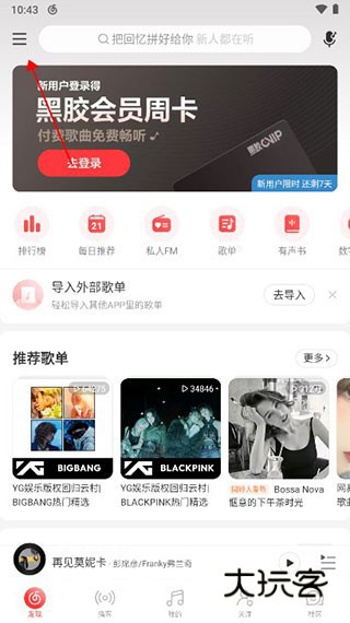 1、打开手机网易云音乐首页,点开左上角的三横杠。