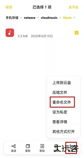 3、找到文件后,选择右下角更多,点击重命名文件。