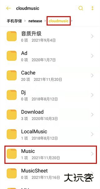 1、开启 文件管理 ,在cloudmusic文件夹下点击Music文件夹。