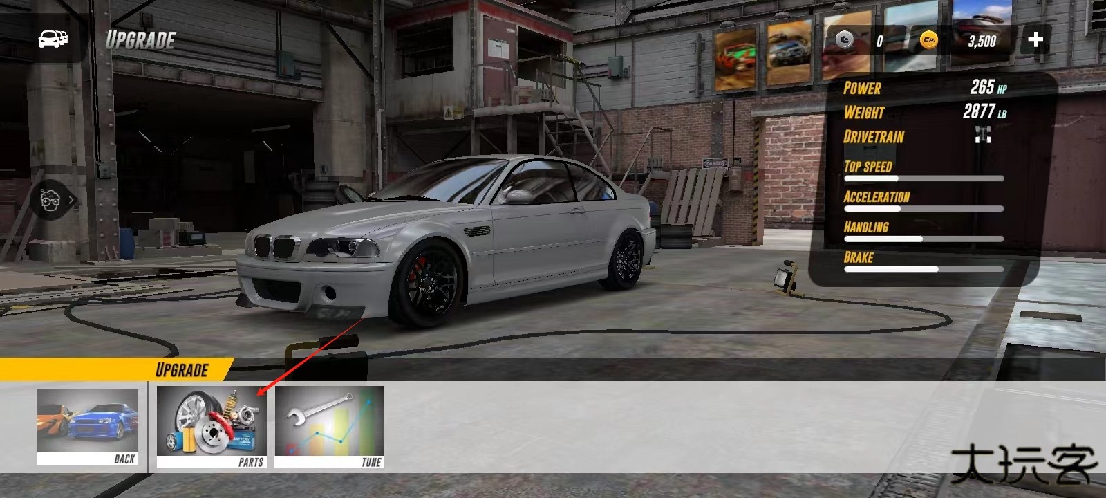 10、还差任务?需要升级爱车!返回车库点开【UPGRADE】,接着找到【PARTS】,这里就能看到各种能买到的升级零件了,按需升级你的座驾吧