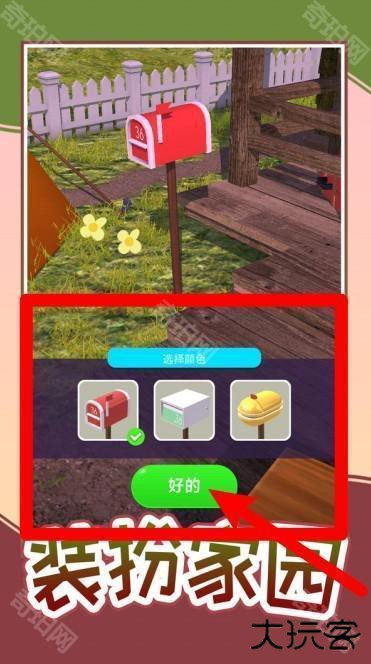 1.在建造任务中可为物品选择不同的颜色和样式,这里玩家为邮箱挑选外观,确认后将应用到庭院装饰。