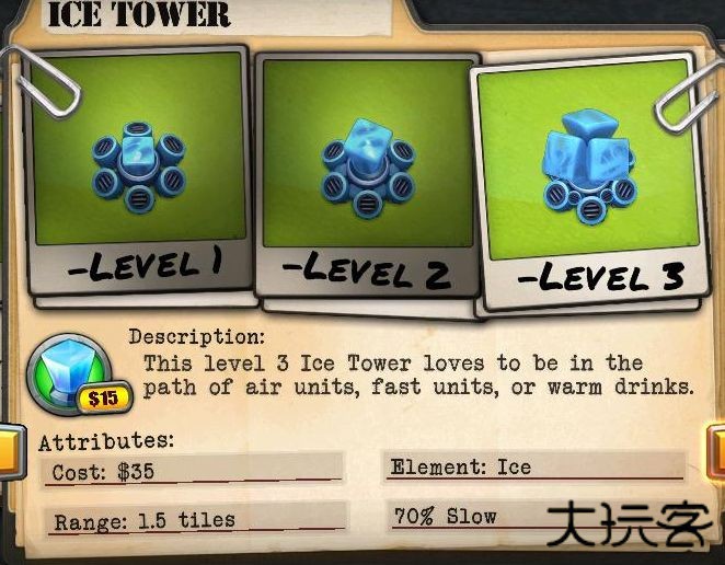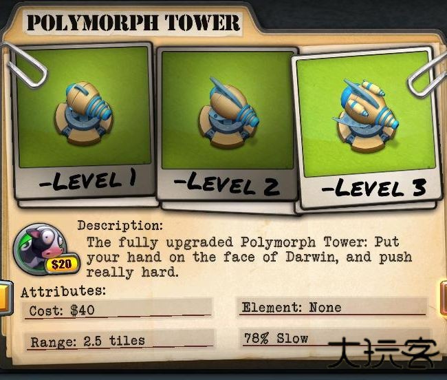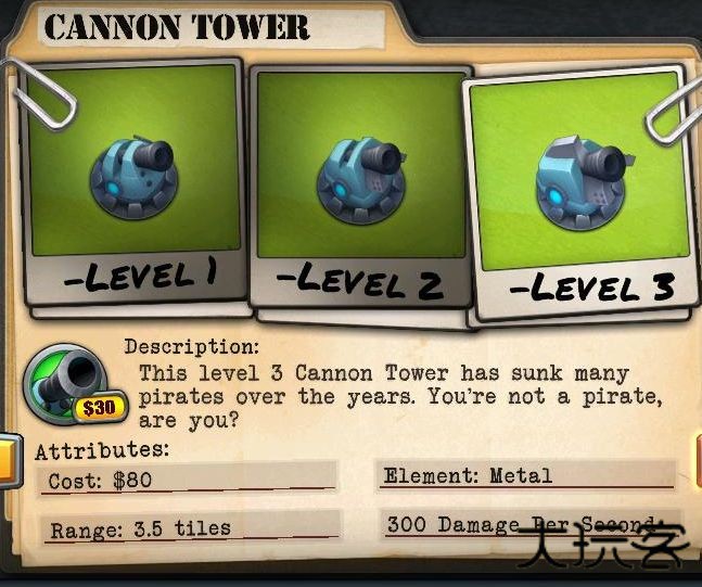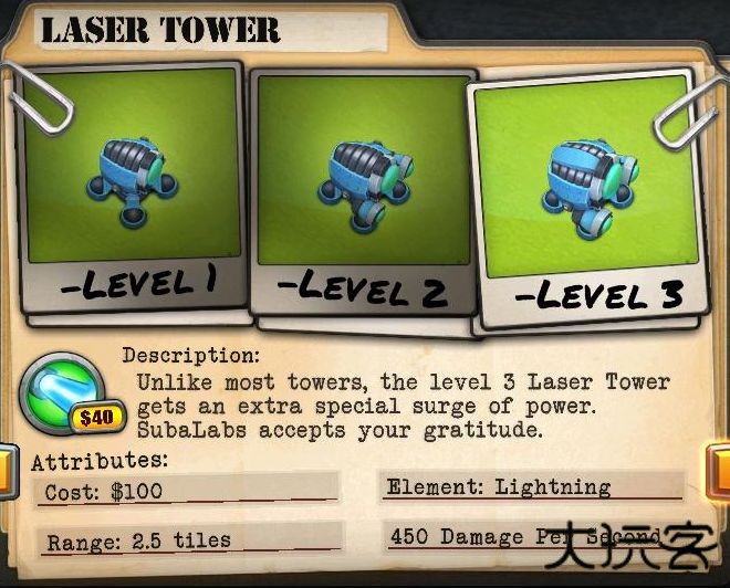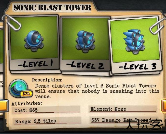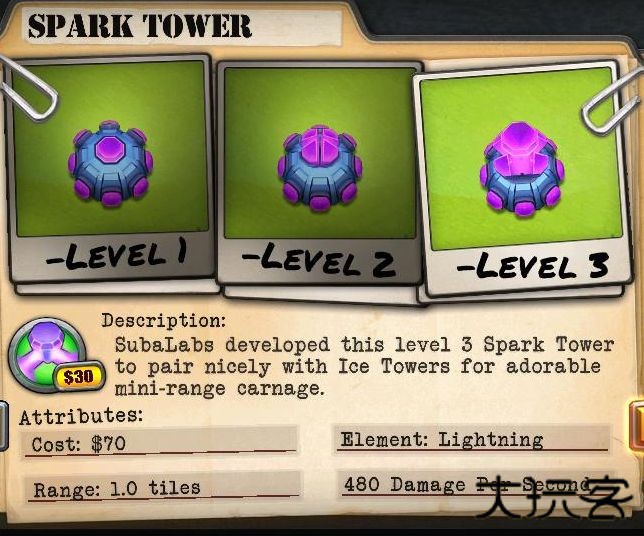 这个炮塔需要与火焰炮塔组合才能获得最大的攻击加成效果。但是花费也是很高的,最高升级需要110金钱