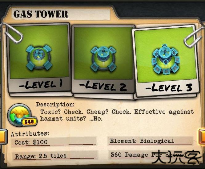 具有比粘胶炮塔还高的迟缓属性,但是还是一个价格的问题。玩家整个游戏流程不可能将太多太多的金钱放在辅助类建筑物之上