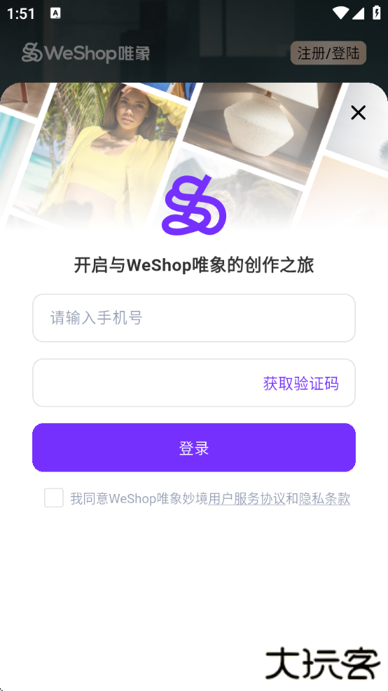 2、同意权限,使用手机号和验证码进行注册或登录。