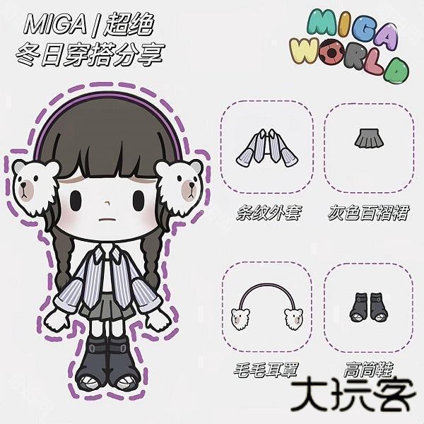 3、条纹外套+灰色百褶裙+毛毛耳罩+高筒鞋。