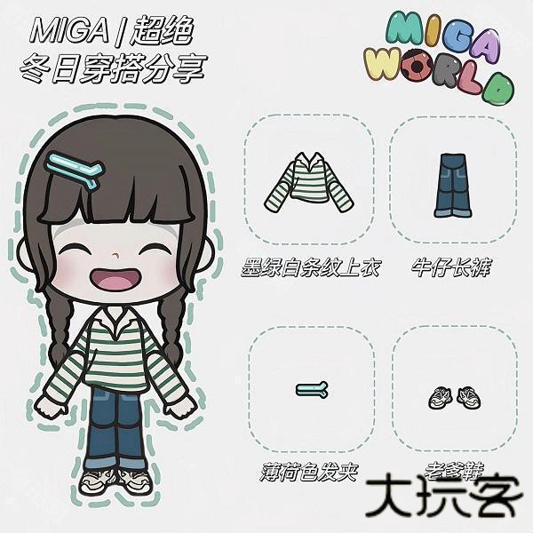 1、墨绿白条纹上衣+牛仔长裤+薄荷色发夹+老爹鞋。