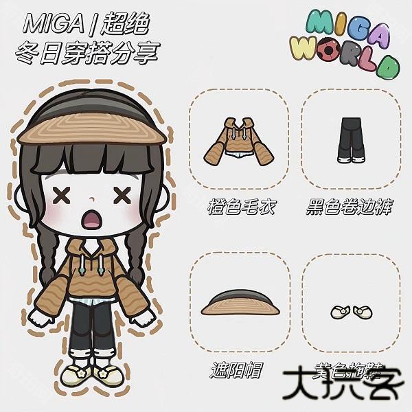 6、橙色毛衣+黑色卷边库+遮阳帽+黄色拖鞋。