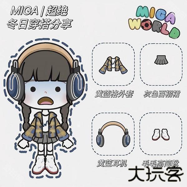 5、黄蓝格外套+灰色百褶裙+黄蓝耳机+毛毛高筒靴。
