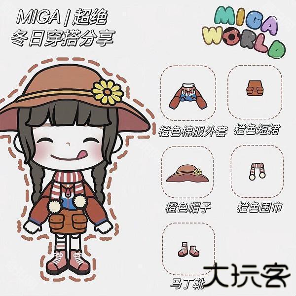 7、橙色棉服外套+橙色短裙+橙色帽子+橙色围巾+马丁靴。