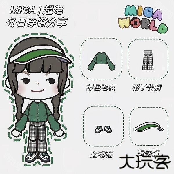 4、绿色毛衣+格子长裤+运动鞋+运动帽。