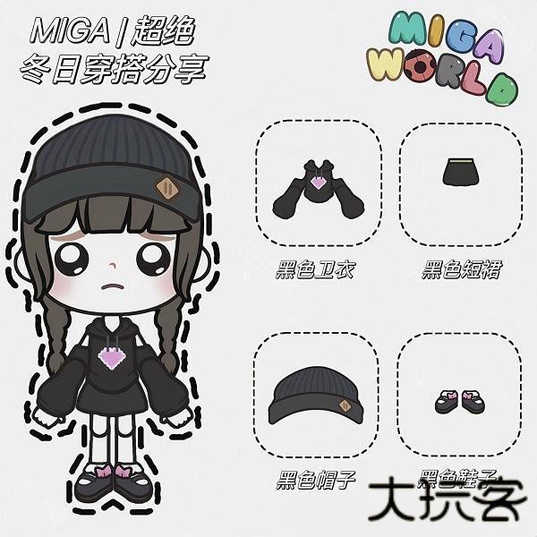2、黑色卫衣+黑色短裙+黑色帽子+黑色鞋子。