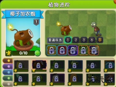 14、椰子加农炮,需要点击向前方开炮对僵尸造成范围伤害,种植需要400阳光,技能效果为发射一颗延迟爆炸的炮弹并击退僵尸。