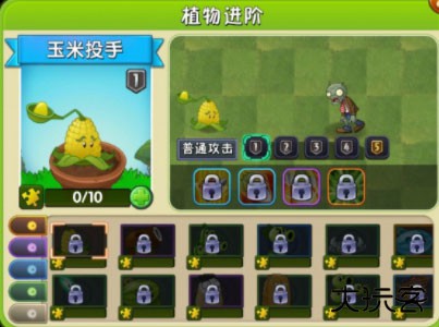 11、玉米投手,向前方僵尸投出玉米粒造成伤害或者投出可以定住僵尸的黄油,种植需要花费100阳光,技能效果为抛出大量黄油对僵尸造成伤害并且定身。