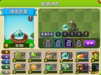 6、冰冻生菜,冻住踩到的僵尸,也可以熄灭火炬僵尸的火把,种植不用阳光,技能效果为冻住全屏僵尸。