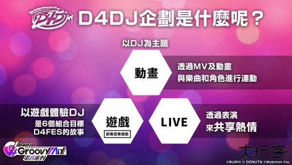 首款女DJ 电音手机游戏跟好友一起MIX!成为舞池中的人气DJ!「D4DJ 企划」是指以DJ 为主题,以动画、游戏、LIVE 为中心展开的复合型媒体计画。