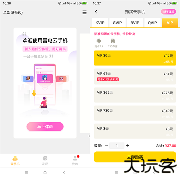 2、点击立即体验,购买云手机(目前推荐Qvip、Svip)