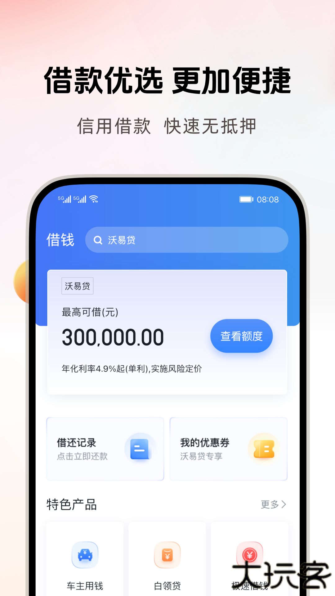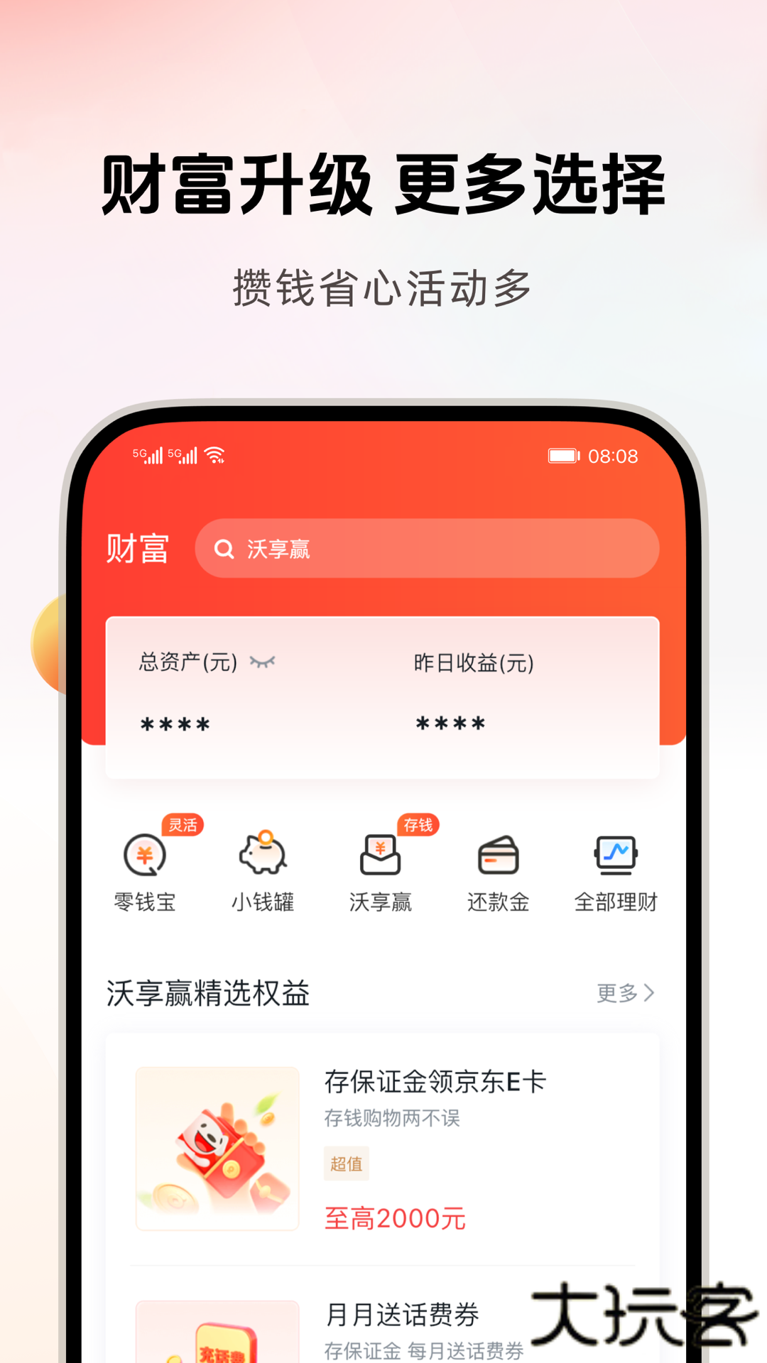 3、提供沃理财(低门槛理财)、沃易贷(快速放款)、信用卡还款(支持多银行)。