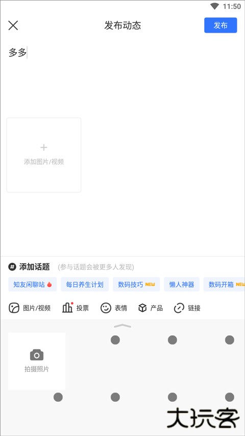 3、输入要发布的内容,以及添加话题,图片等,最后点击右上角发布即可;