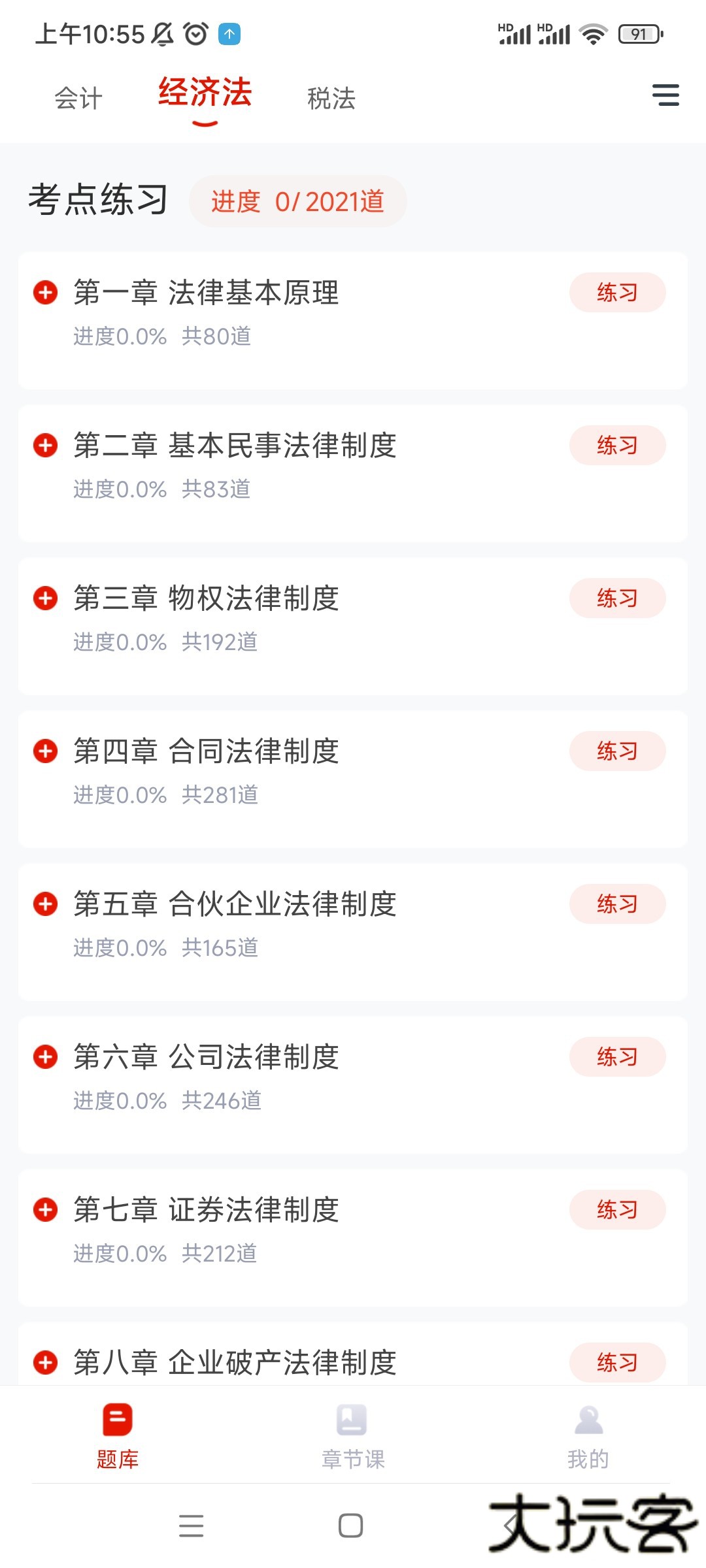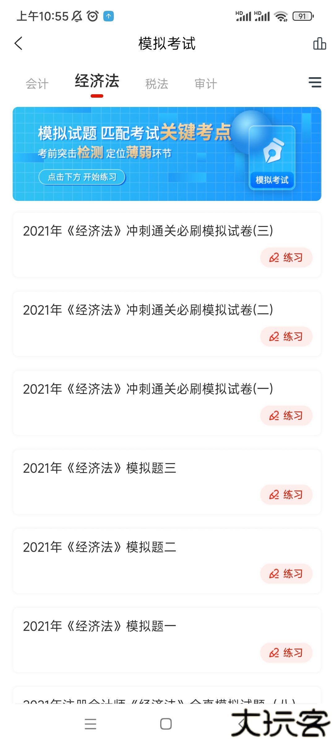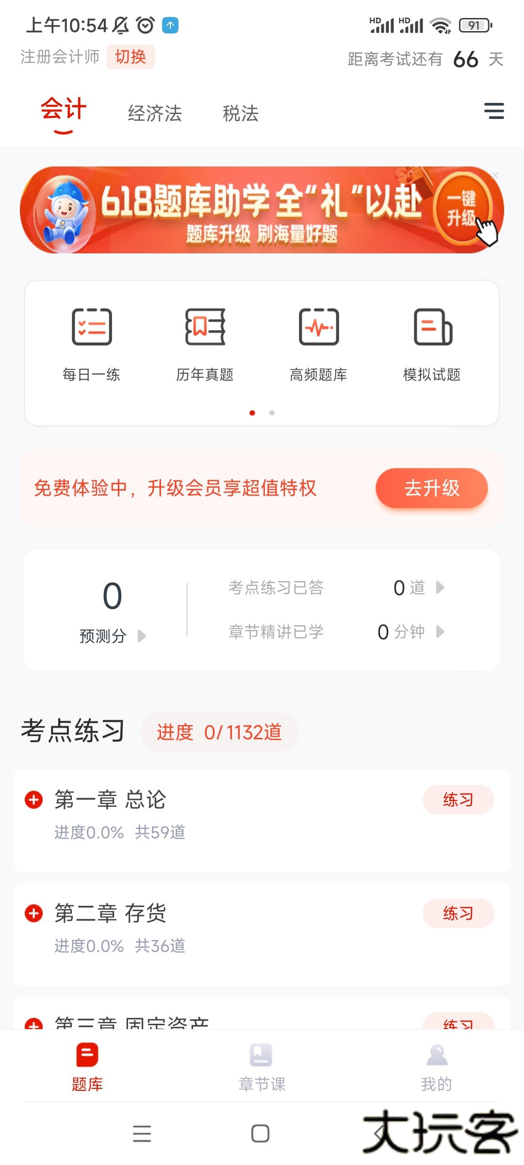 2、比方说用户选择“会计”科目后,将进入习题界面。在此界面中,可以找到多种练习方式,包括考点练习、历年真题和模拟考试等。