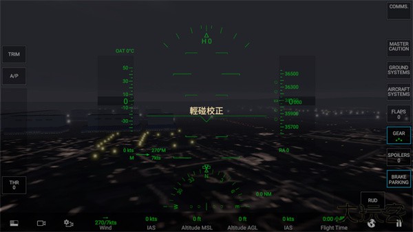 1,进入rfs模拟飞行游戏中,点击“开始起飞”后,进入正式的飞行界面。首先会提示需要轻触校正,校正的目的是为了确认手机在什么角度是飞机平飞的角度状态。