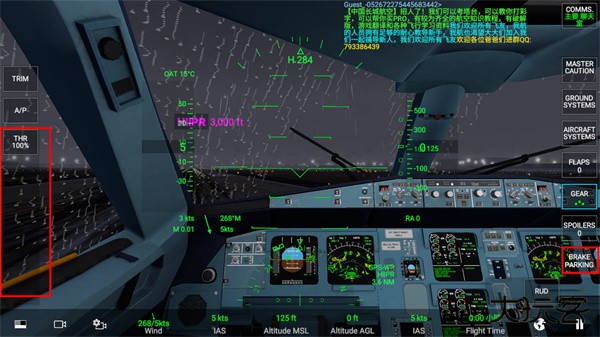 4,调整好襟翼后,我们就可以松开刹车BRAKE,然后滑动左侧的油门THR,将油门推到100%。