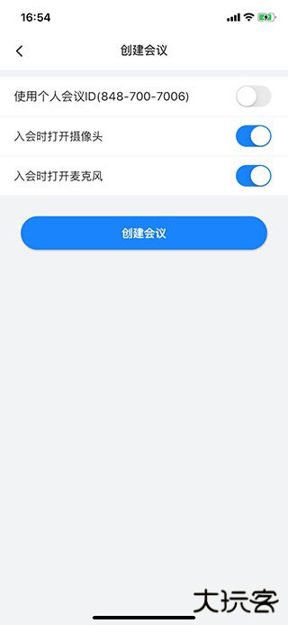 2、为每个注册用户生成一个10位数的个人会议ID,用户也可以选择使用随机会议ID(9位数字)。用户还可以选择入会时是否打开摄像头和麦克风。点击创建会议按钮即可