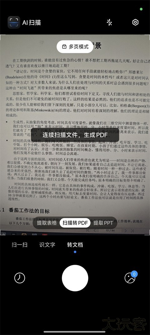 3、在“扫描转PDF”界面选择“多页模式”,连续拍摄多页文件。