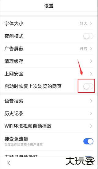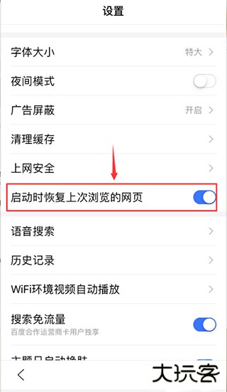 4、然后在设置页面里有个 启动时恢复上次浏览的网页;