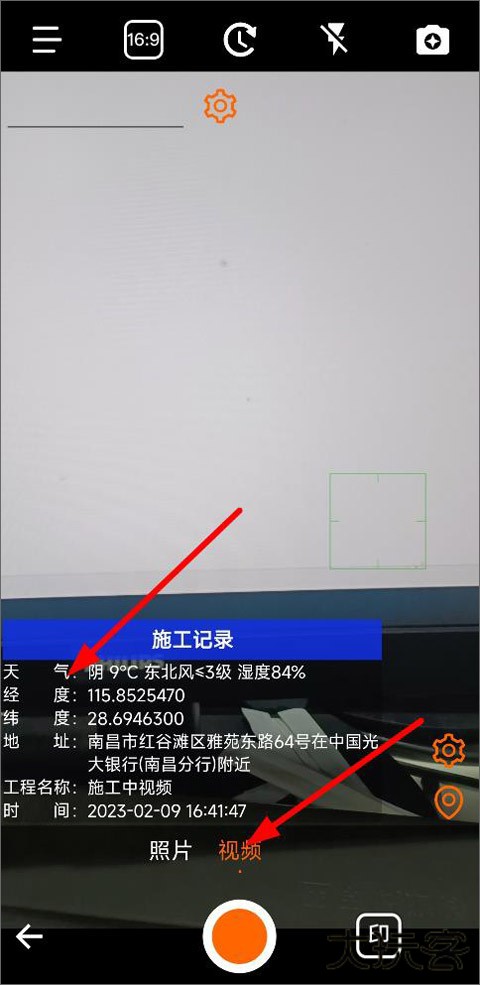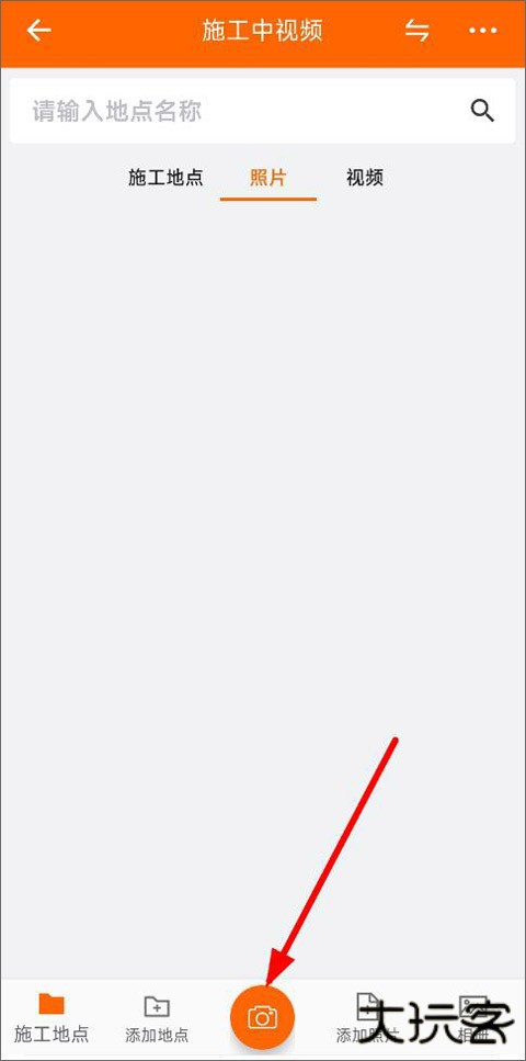 2、创建工程项目后,进入该工程页面,可以添加施工地点、照片、视频,点击下方的相机标志;