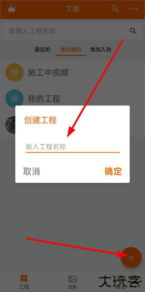 1、打开工程相机app,进入主页面,点击右侧“+”创建工程并填写工程项目名称;