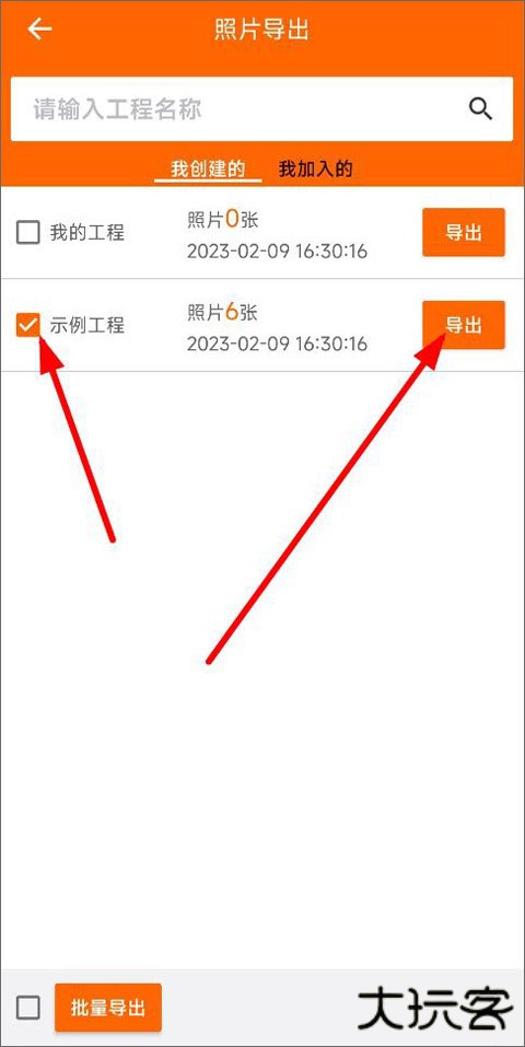 2、在照片导出页面用户可搜索工程名称查找照片(我创建的、我加入的),左侧选择工程相册点击右侧导出;