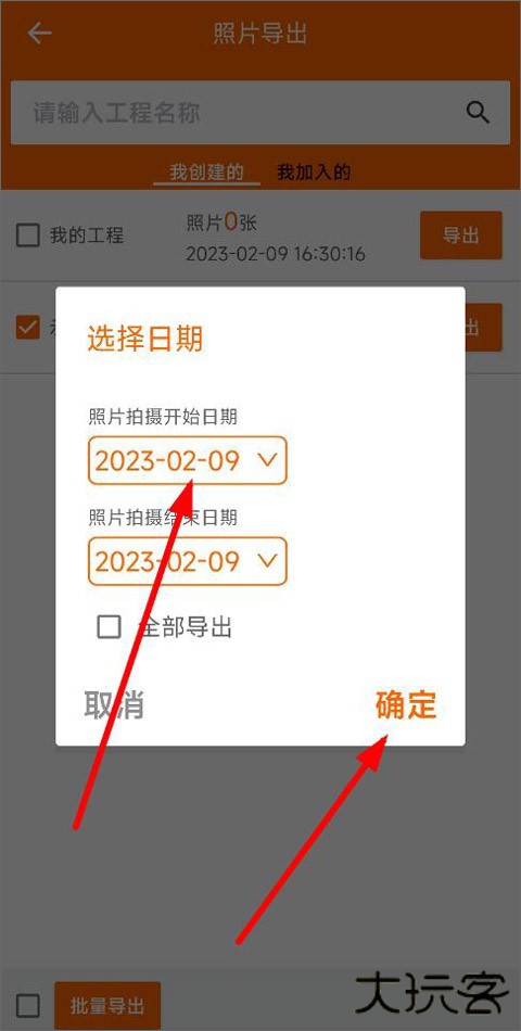 3、确定导出后,选择照片拍摄开始/结束日期,点击确定;