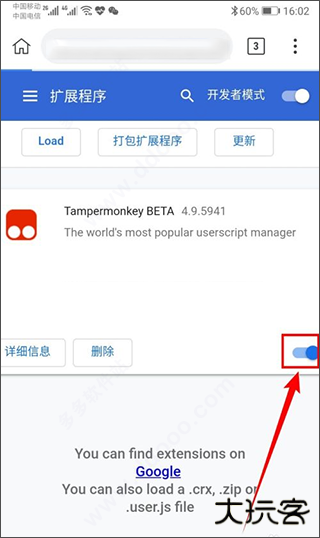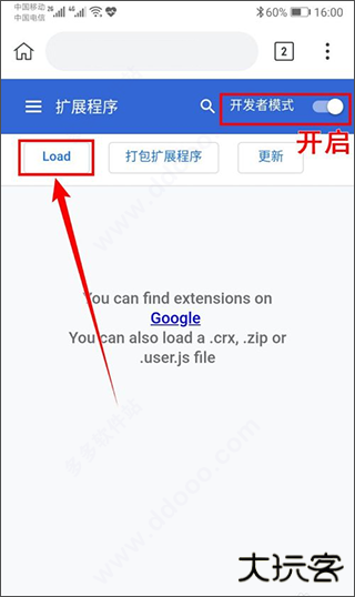 4、在扩展页面中开启【开发者模式】,然后点击【Load】按钮。