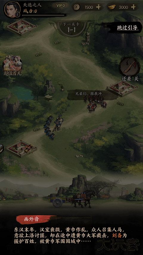 1.初入游戏,一段东汉末年的风云剧情便会徐徐展开,若你无心细品,可以自行跳过,快速开启后续征程。