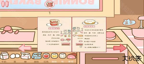 5、点击右下角的菜谱,点击可以翻动页面,按照步骤选择合适的食材放入工具内,制作需要的甜品。
