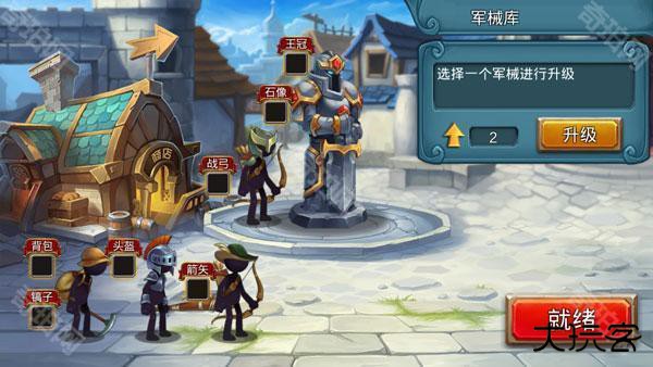 3、每次对战前,可以在军械库里升级矿工、士兵和雕像的相应属性,提升火柴人军团的战斗值。